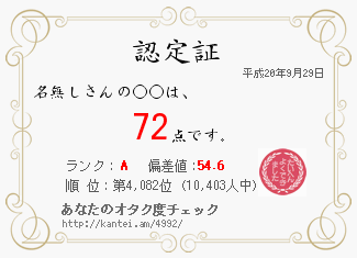 アニメオタク度測って来てやったよ、喜べアリス!!!! 名無しさんのアニメオタク度は 30 %です。 ランク: D (A~E) 偏差値: 43.6 順位: 102,204位 (144,614人中) そう、完全に数分の狂いもなく数的に平均です 総評 ビデオレンタル店のアニメコーナーに行きたくても周りの目が気になってたりしませんか? 周囲の人にアニメを見ていることを秘密にしているのでは? カミングアウトするなら早い方がいいですよ? 隠れオタクのレベルです。 名無しさんのオタクランクは日本人の中で8396万6942位です。 名無しさんが行うべき事 EPG「電子番組ガイド」で新アニメ探し ゲーオタですね、分かります では^^ノシ